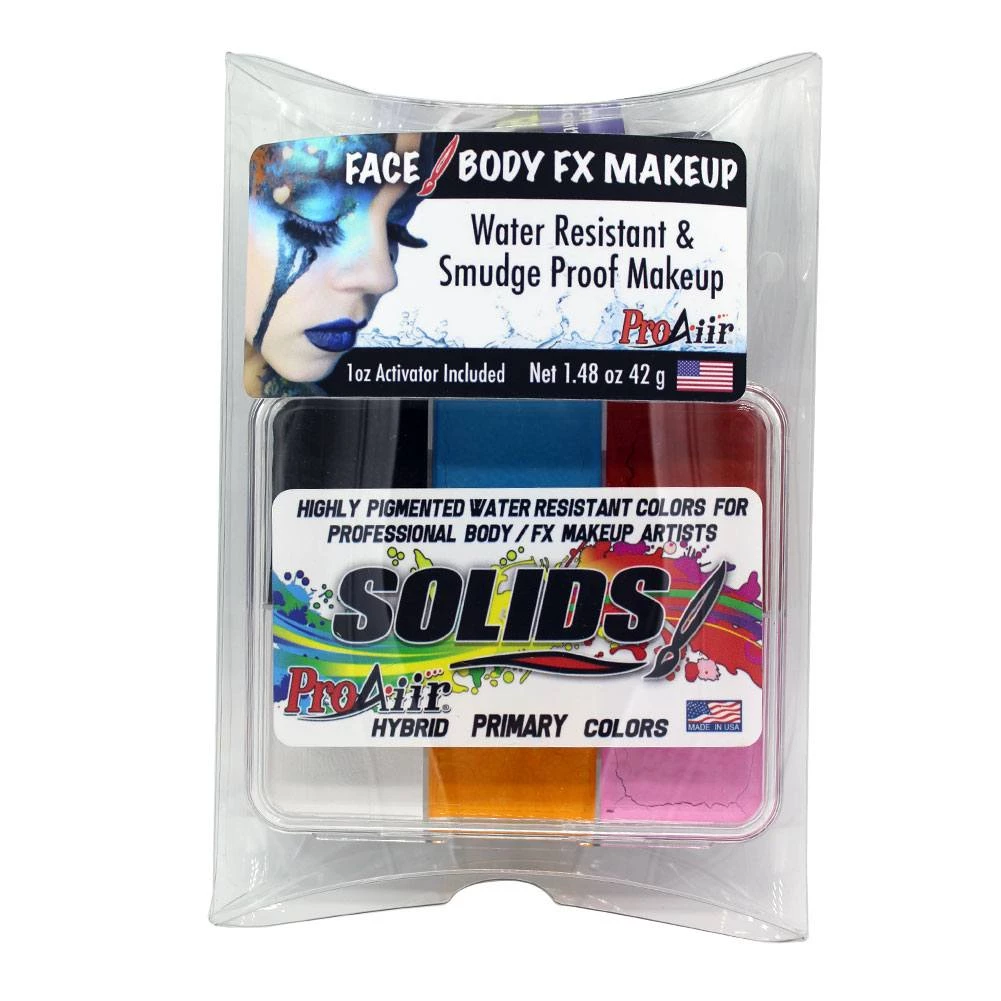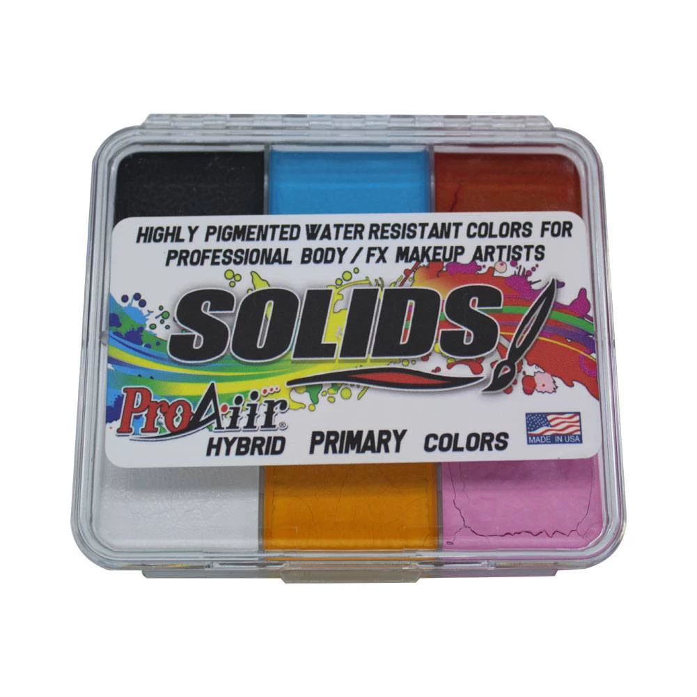 ProAiir Solids Primary Makeup Palette has the following colors of ProAiir Solids Makeup: White, Black, Electric Blue, Yolk Yellow, Bubblegum Pink and Lipstick Red, 7 gm each.