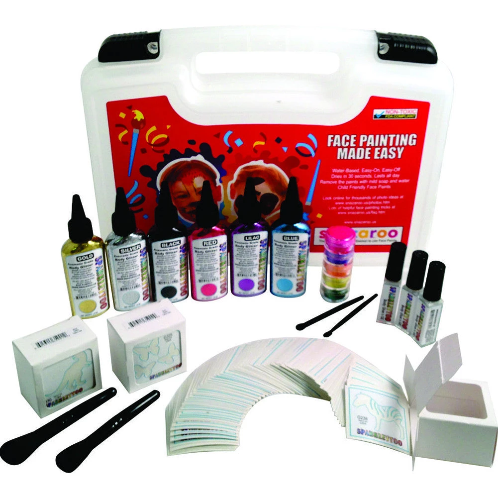 Ruby Red Professional Glitter Tattoo Kit (A) is a fantastic kit for creating beautiful glitter tattoos enjoyed by both children and adults. The professional quality stencils and body glitter in this set cover a range of popular colors and designs so there is something for everyone. The ultra-fine Glitter comes in a squeezable bottle with a specially designed tip that can be used to do the “poofing” technique for glitter tattoos. The Stencils are made with a stronger, thinner vinyl that has a light tackiness for more comfortable application/removal. Ruby Red Glitter Tattoos are so easy to apply with a fast drying, waterproof formula that lasts up to one week depending on where tattoo is placed. Kit A features a selection of fun themed tattoos that are ideal for children’s parties, fundraising, community events and more! This Kit will do 300 glitter tattoos.