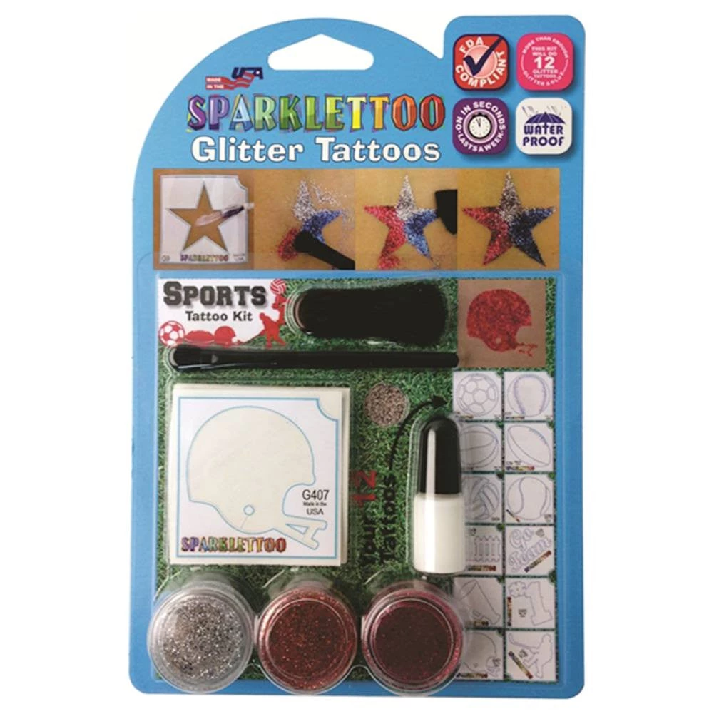 Ruby Red Sport Sparklettoo Kit is the perfect starter pack for making temporary glitter tattoos on body. Ruby Red Glitter Tattoos are fast drying and waterproof, lasting for up to one week depending on where tattoo is placed. Each glitter kit includes 12 tattoo stencils (2×2 inch), 3 colored glitter jars (.13 ounce), 1 body glue bottle (.063 ounce), 1 duster brush and 1 applicator brush in a blister carded pack. The Sport Kit features a selection of fun, sports themed tattoos that are great for children’s sporting events, birthday parties, fundraising, community events and more!