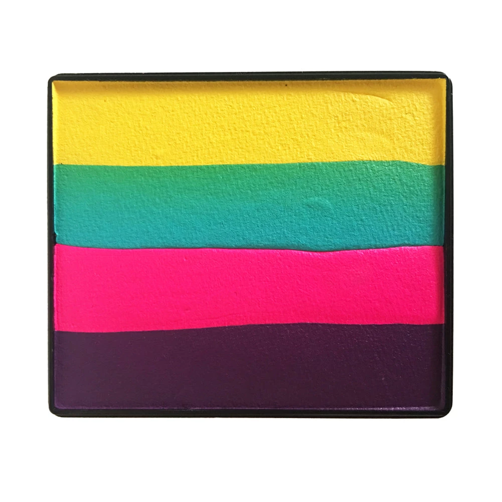 Rainbow cakes are best used with a half sponge, body brushes or “wisp” brushes. Rainbow cakes can also be used with Face Paint Stencils. Gives about 100-500 applications.