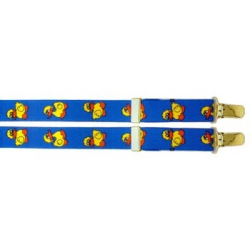 1.0 inch wide, 48 inch long light blue suspenders with cute yellow duckies on them! Silver-toned regular clips.