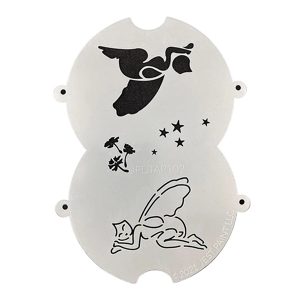 TAP Face Paint Double Stencils – Sleeping Fairy (102) includes two stencils, one for filling the design and other for outline work, perfect to create a beautiful fairy design accent above the eyebrows, cheeks, arms or as a centerpiece on the forehead. TAP Face Paint Stencils are small, flexible mylar stencils that are designed for quickly adding fun design elements to face and body art. They are easy to use with face paints, powders, glitters or temporary tattoo ink. TAP Stencils can be easily wipe cleaned and stored and reused multiple times, if handled with gentle care.