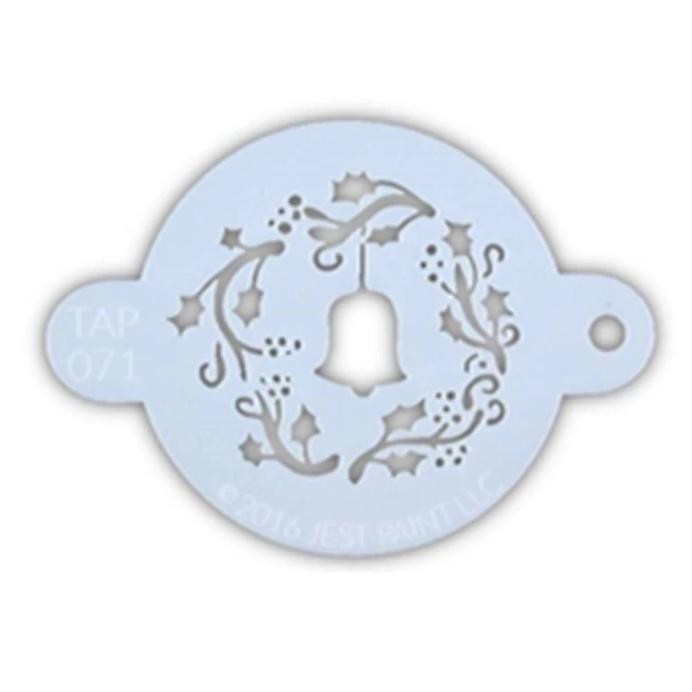 TAP Face Paint Stencil – Christmas Wreath with Bell (071) is a small stencil that can be used to comfortably add a design accent to any part of your face or arm. TAP Face Paint Stencils are small, flexible mylar stencils that are designed for quickly adding fun design elements to face and body art. They are easy to use with face paints, powders, glitters or temporary tattoo ink. TAP Stencils can be easily wipe cleaned and stored and reused multiple times, if handled with gentle care.