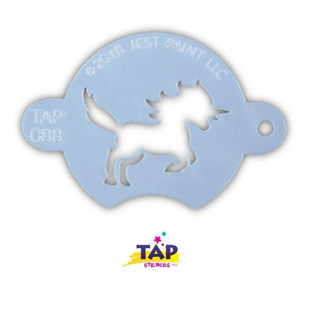 TAP Face Paint Stencil – Prancing Unicorn (088) is a small stencil that can be used to comfortably add a design accent to any part of your face or arm. TAP Face Paint Stencils are small, flexible mylar stencils that are designed for quickly adding fun design elements to face and body art. They are easy to use with face paints, powders, glitters or temporary tattoo ink. TAP Stencils can be easily wipe cleaned and stored and reused multiple times, if handled with gentle care.