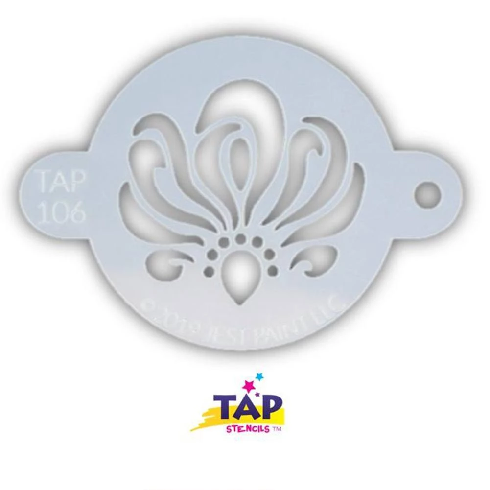 TAP Face Paint Stencil – Swirly Ribbon Centerpiece (106) is a small stencil that can be used to comfortably add a design accent to any part of your face or arm. TAP Face Paint Stencils are small, flexible mylar stencils that are designed for quickly adding fun design elements to face and body art. They are easy to use with face paints, powders, glitters or temporary tattoo ink. TAP Stencils can be easily wipe cleaned and stored and reused multiple times, if handled with gentle care.