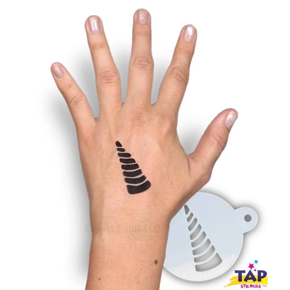 TAP Face Paint Stencil –Â Unicorn Horn Swirl (104)Â is a small stencil that can be used to comfortably add a design accent to any part of your face or arm. TAP Face Paint Stencils are small, flexible mylar stencils that are designed for quickly adding fun design elements to face and body art. They are easy to use with face paints, powders, glitters or temporary tattoo ink. TAP Stencils can be easily wipe cleaned and stored and reused multiple times, if handled with gentle care.