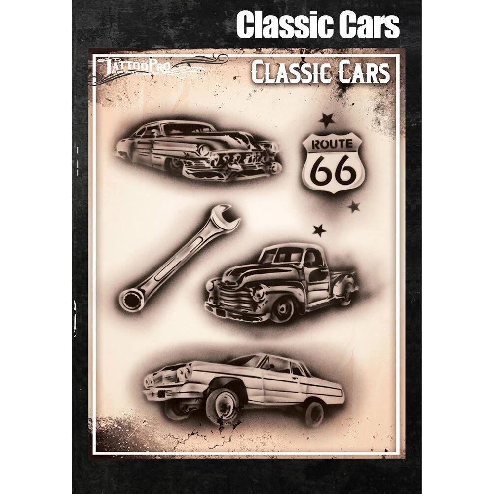 Tattoo Pro Series 4 Classic Cars Stencil design sheet contains 3 classic automobile stencils, 1 wrench stencil, 1 route 66 stencil and other elements for creating realistic airbrush tattoos.