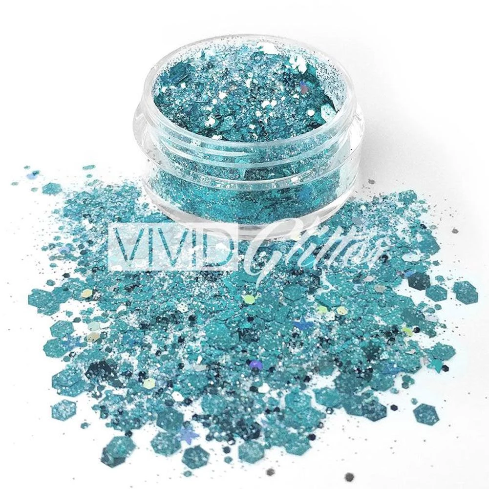 VIVID Glitter Loose Chunky Glitter Mix – Angelic Ice (10 gm) is a mix of frosted blue in large-cut glitter, that will create amazing effects in body painting. Also available as part of 5 piece christmas miracle glitter stack. Also available as gleam glitter cream.