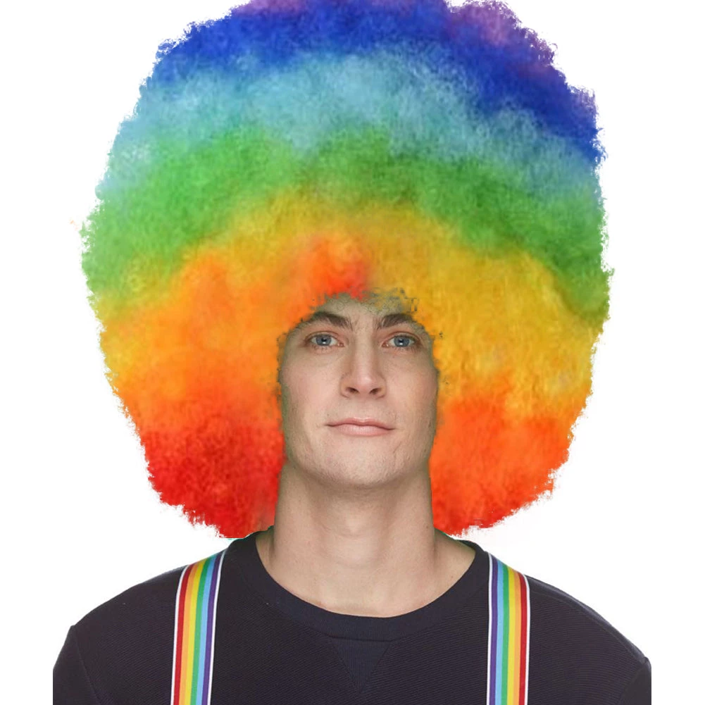 Gigantic curly afro style rainbow wig. Not really for the professional clown, but ideal for characters and Halloween clowns, this sky high afro towers above the rest! Approximately 19 to 20 inches long. By WestBay.