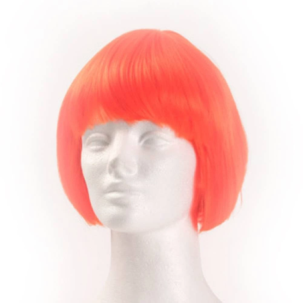 Adorable, neon orange, short wig with straight bangs.