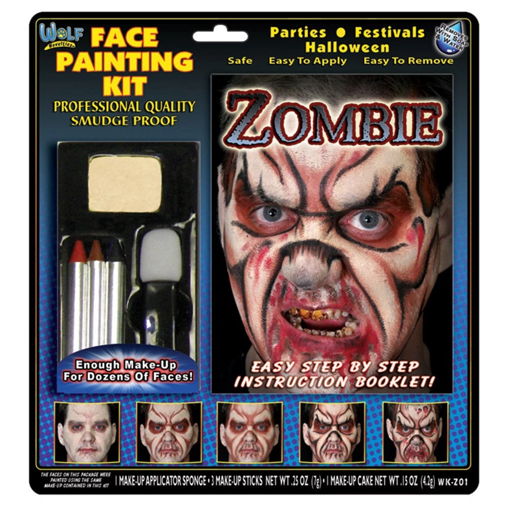 Wolfe Zombie Face Painting Kit is an easy-to-use professional quality face painting makeup kit. The Kit comes with full color photographs and a step-by-step instruction book. This is a kit for the beginner face painter and novices who want to learn. Wolfe paint is the high-in-demand face paint that goes on smoothly and evenly and does not smear or crack once it is on the skin.